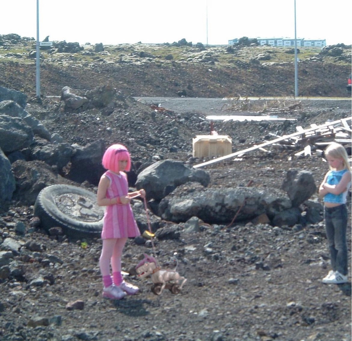 I found a photo that I haven't seen before. Julianna as Stephanie walking the dog (Audrey) in Iceland on some old lava field, probably just outside the studio.