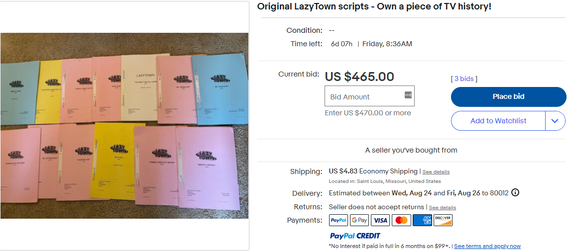 I would like to have one of those scripts for a acceptable price just to see how it looks like. It's too much money for the whole collection. Someone buys it and donates to the Lazytown museum would be nice gesture.