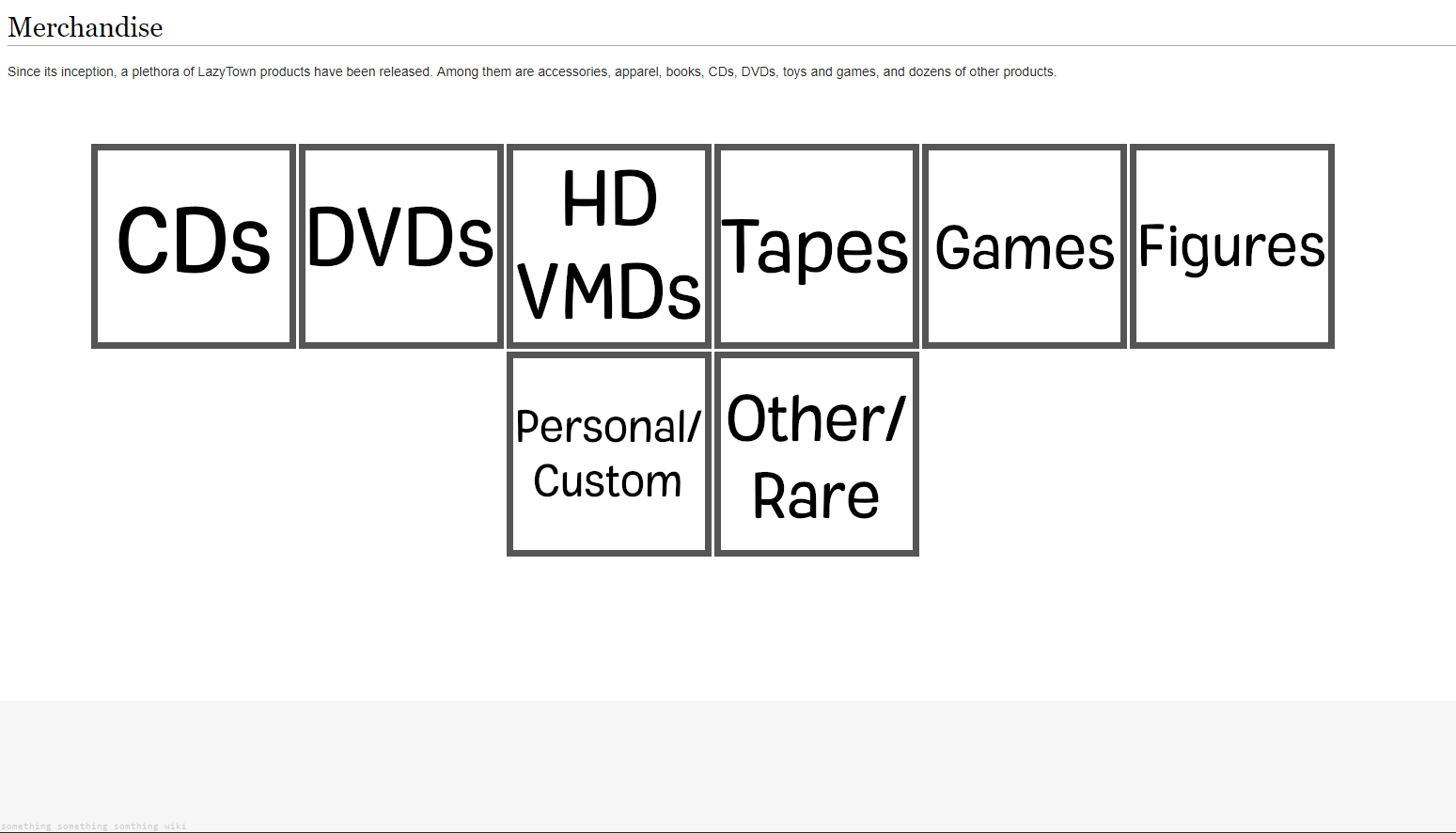 It would be interesting to somehow catalog all of the merch we have and have found into a giant document/webpage, including stuff that is theoretically out there but we haven't found yet (Like an Γ‘fram disc) or is just rumored (such as a 2012 annual). It could be sorted into the different media - Physical objects/figures, written, digital audio, analog audio (the bing bang vinyl), video, paintings (like the krakkabanki one), you name it. These merch piece segments would ideally have a picture (from the internet or taken by yourself) and a sentence or two explaining what it is, what it may be worth (at the time of writing), when it was made, if there is a special story behind said merch, etc. It may not be a big flashy project to show off to everyone, but I think it would be interesting to document, especially for some of the more rare stuff...