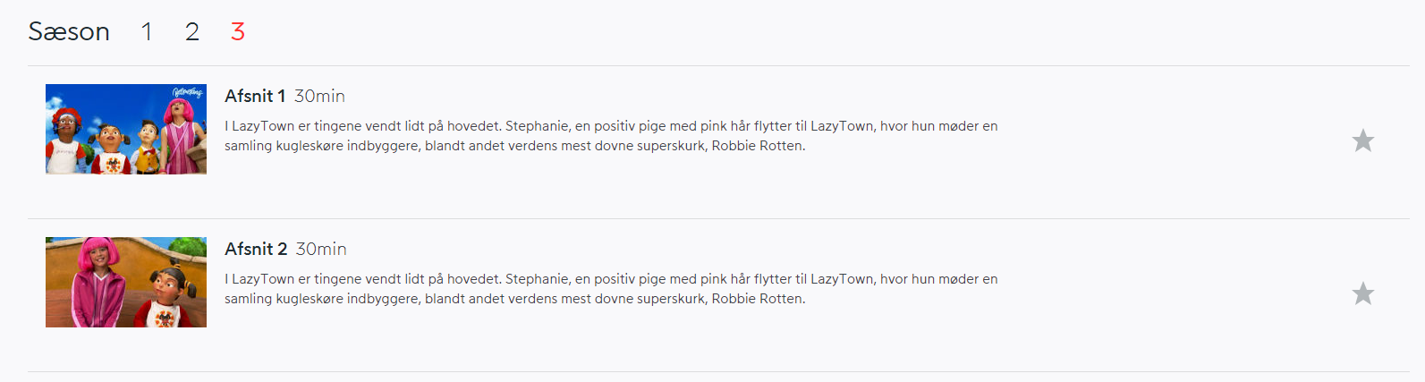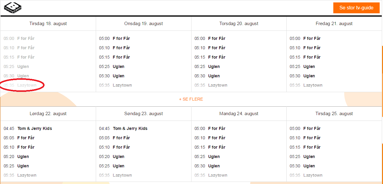 -Denmark (Danish): Lazy Town - Playhouse Disney Scandinavia (2007-2009), TV2 Danmark (2006-2007), Boomerang Scandinavia (2013-present)