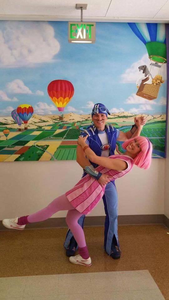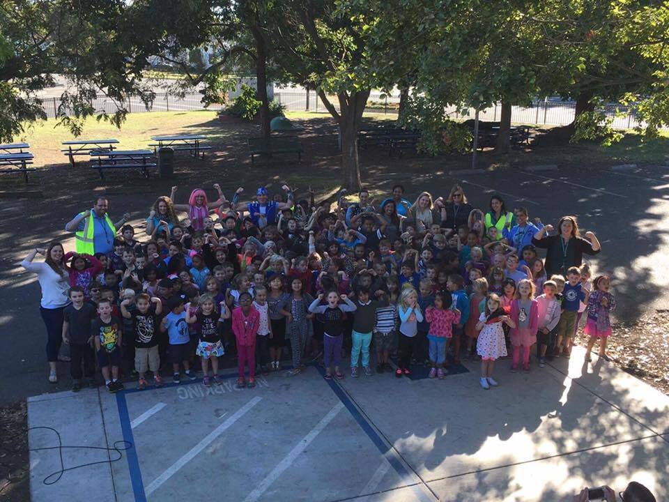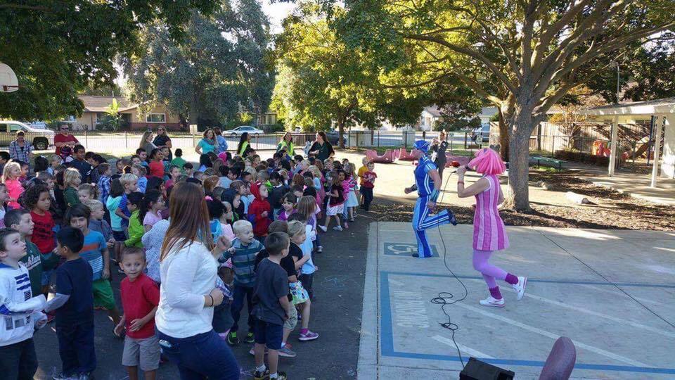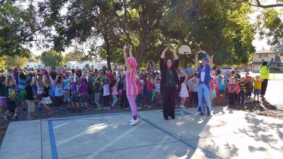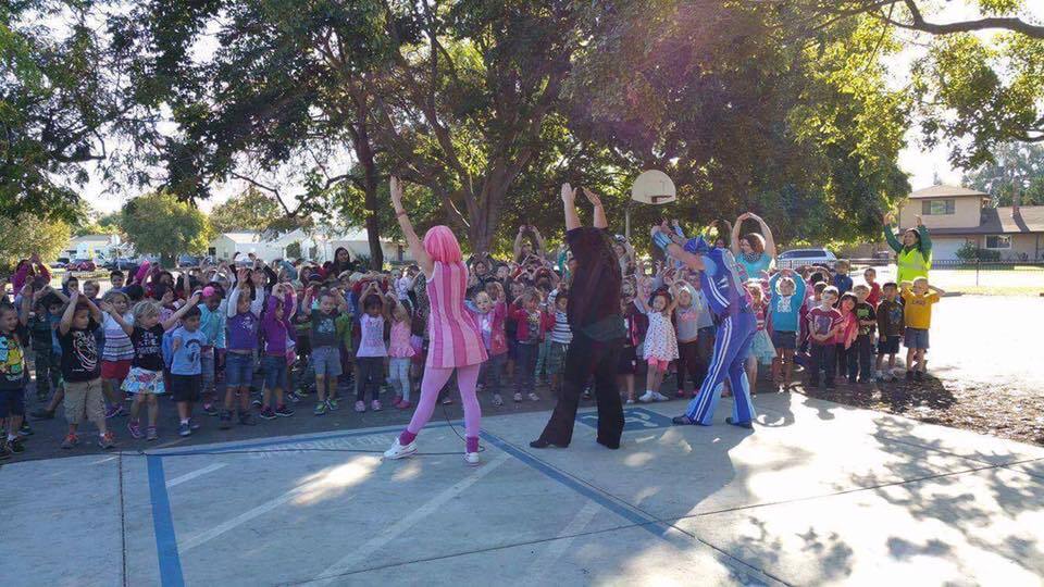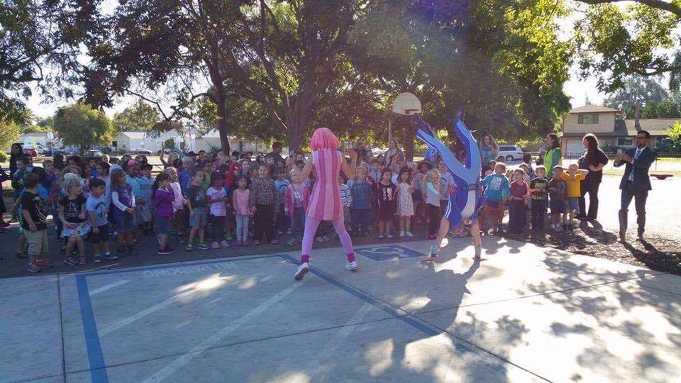 Sportacus and Stephanie with the kids at Sacramento Elementary School and the Children's Hospital of Sacramento.