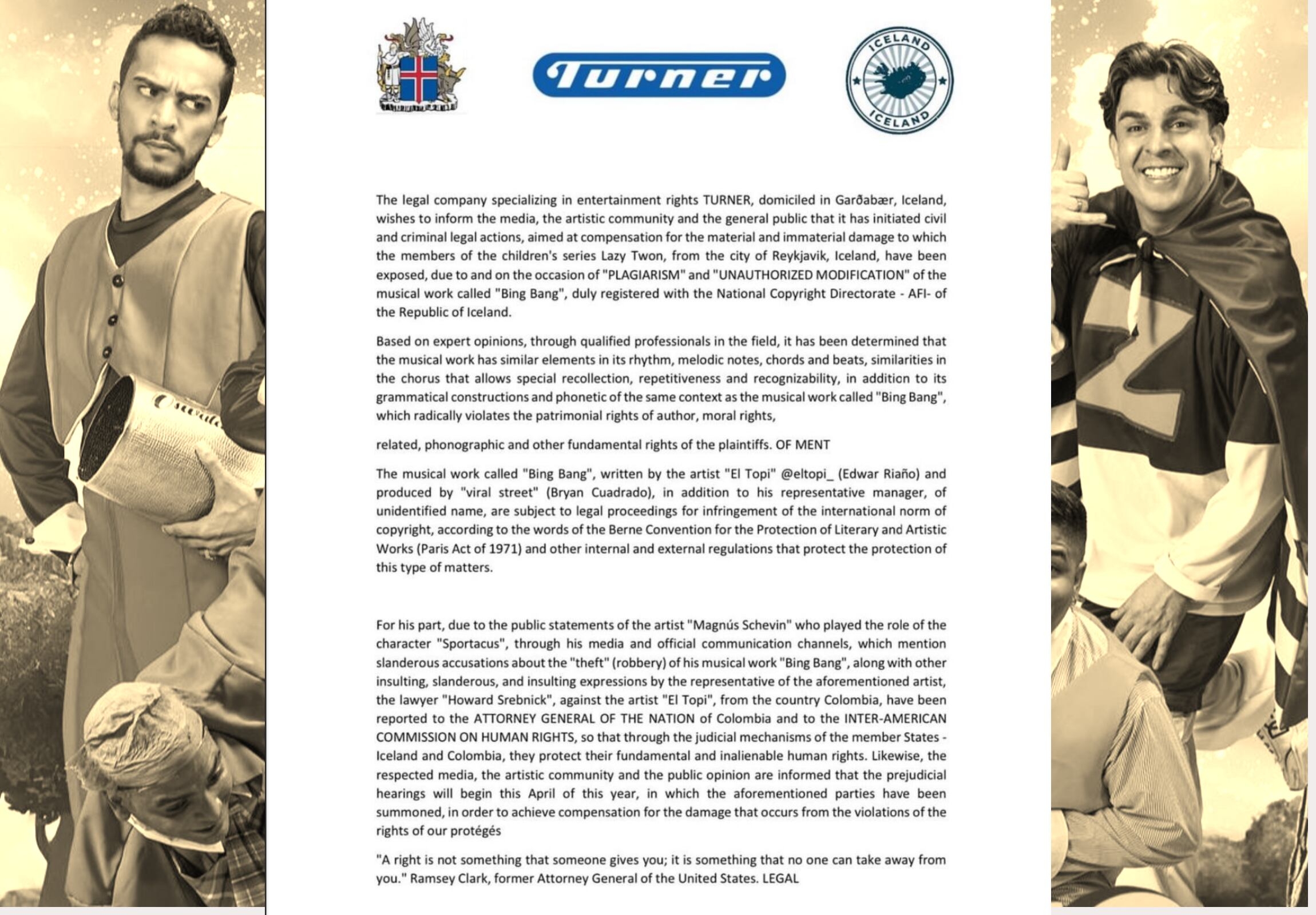 Besides that this is parody and Turner is not located in Iceland, the 'legal letter' is full of mistakes. Like Lazy Twon (instead of LazyTown) and Magnus Schevin (instead of MagnΓΊs Scheving).