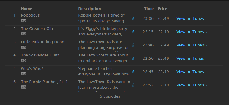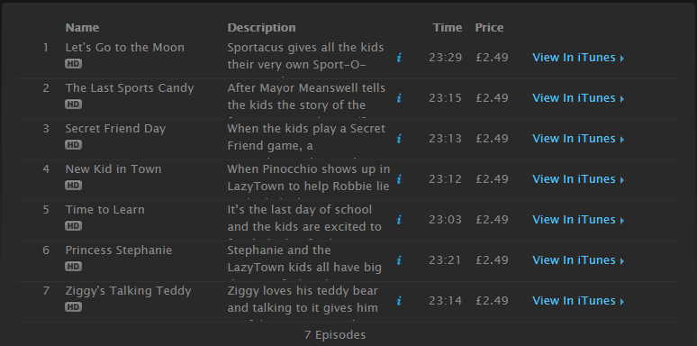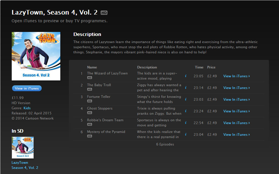 1. Lazy Town, Season 4, Volume 1: https://itunes.apple.com/gb/tv-seaso...-1/id981852169