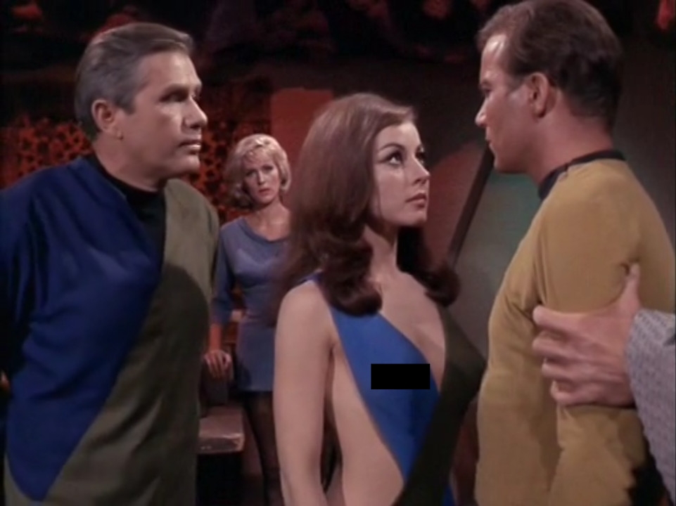 Ok, a little background: the original pilot for the show, which is available now as The Cage on video but was never aired, is the footage you are seeing in the flashbacks there. They didn't want to waste all that expensive footage so they made it the basis of a real episode, as flashbacks. What you are seeing there in those flashbacks is Spock 1.0 (what I like to call The Shouting Spock), Number One (the first officer, who is played by the same woman who plays Nurse Chapel - Majel Barrett - in the actual show, who married Gene Roddenberry, the show's creator) and the original Captain, Christopher Pike, who of course is replaced with James T. Kirk in the actual show with a different actor.